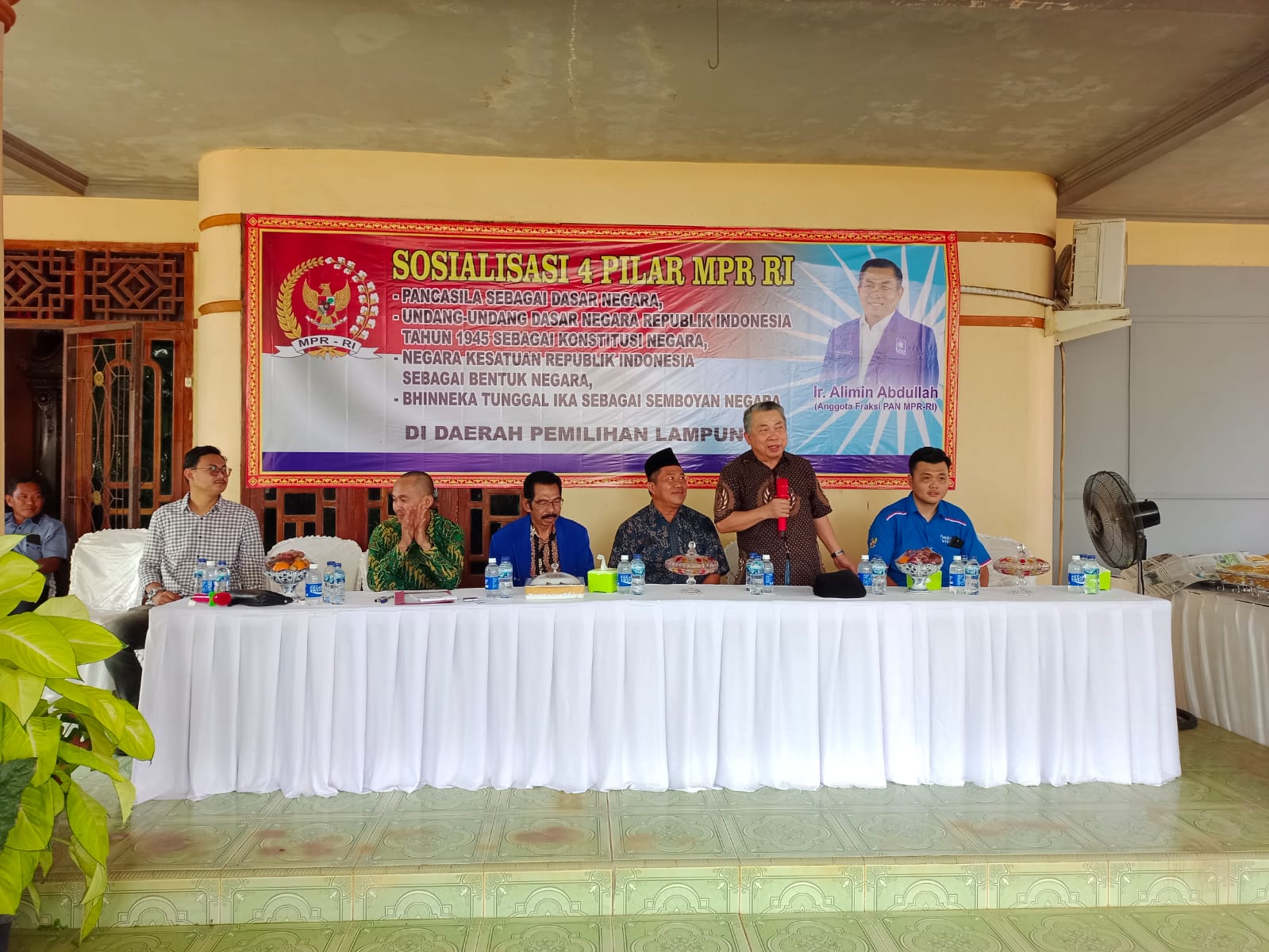LAMPUNG UTARA (KANDIDAT) – Sebagai salah satu upaya penguatan kesadaran berbangsa dan bernegara di tengah masyarakat, Majelis Permusyawaratan Rakyat Republik Indonesia menggelar kegiatan Sosialisasi 4 Pilar MPR RI (Pancasila, UUD 1945, NKRI, dan Bhineka Tunggal Ika) seperti yang di Laksanakan oleh Ir Alimin Abdullah di Desa Margorejo Kecamatan Kotabumi Utara Kabupaten Lampung Utara, Selasa ( 4/4/2023).