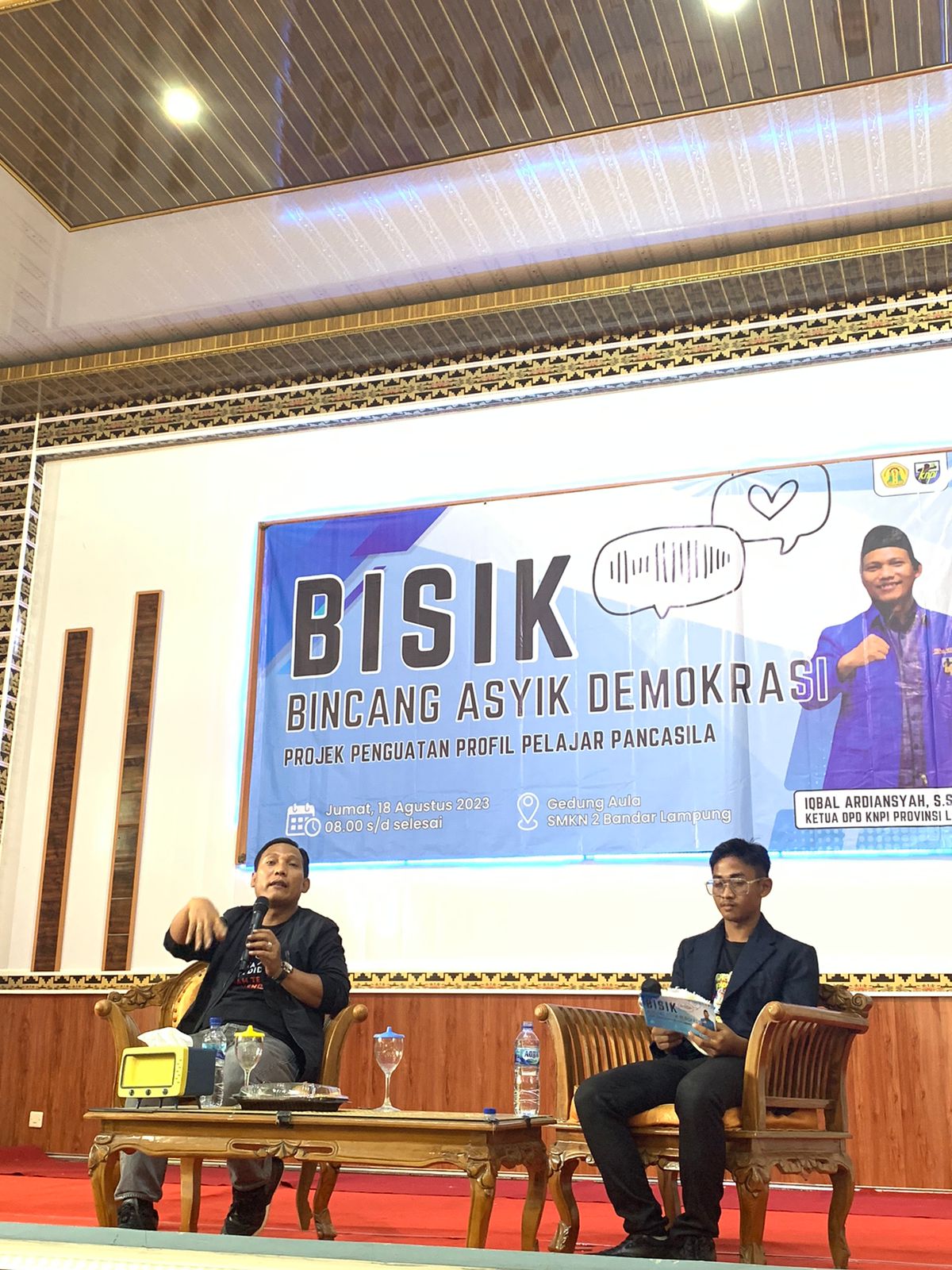 BANDARLAMPUNG – Bincang asyik demokrasi atau bisik yang diselenggarakan oleh Sekolah Menengah Kejuruan Negeri (SMKN) 2 Bandar Lampung Jumat, (18/8/2023), pagi, berjalan dengan sukses dengan tema project penguatan profil pelajar pancasila.