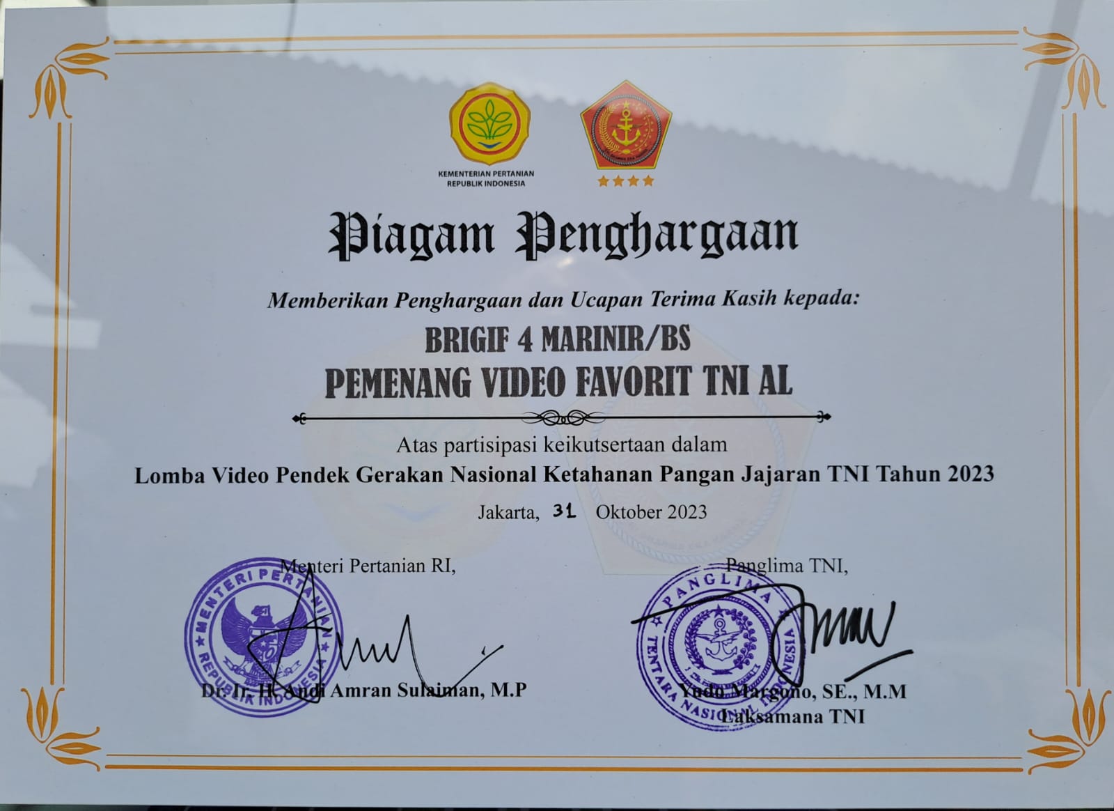 BANDAR LAMPUNG (KANDIDAT) – Korps Marinir, Brigif 4 Mar/BS (Bekasi). Brigade Infanteri 4 Marinir/BS menerima piagam penghargaan dan piala pemenang Favorit TNI AL lomba video pendek Gerakan Nasional Ketahanan Pangan Jajaran TNI tahun 2023 bertempat di Ds. Wanajaya, Kec. Cibitung, Kab. Bekasi, Jawa Barat. Rabu (01/11/2023).