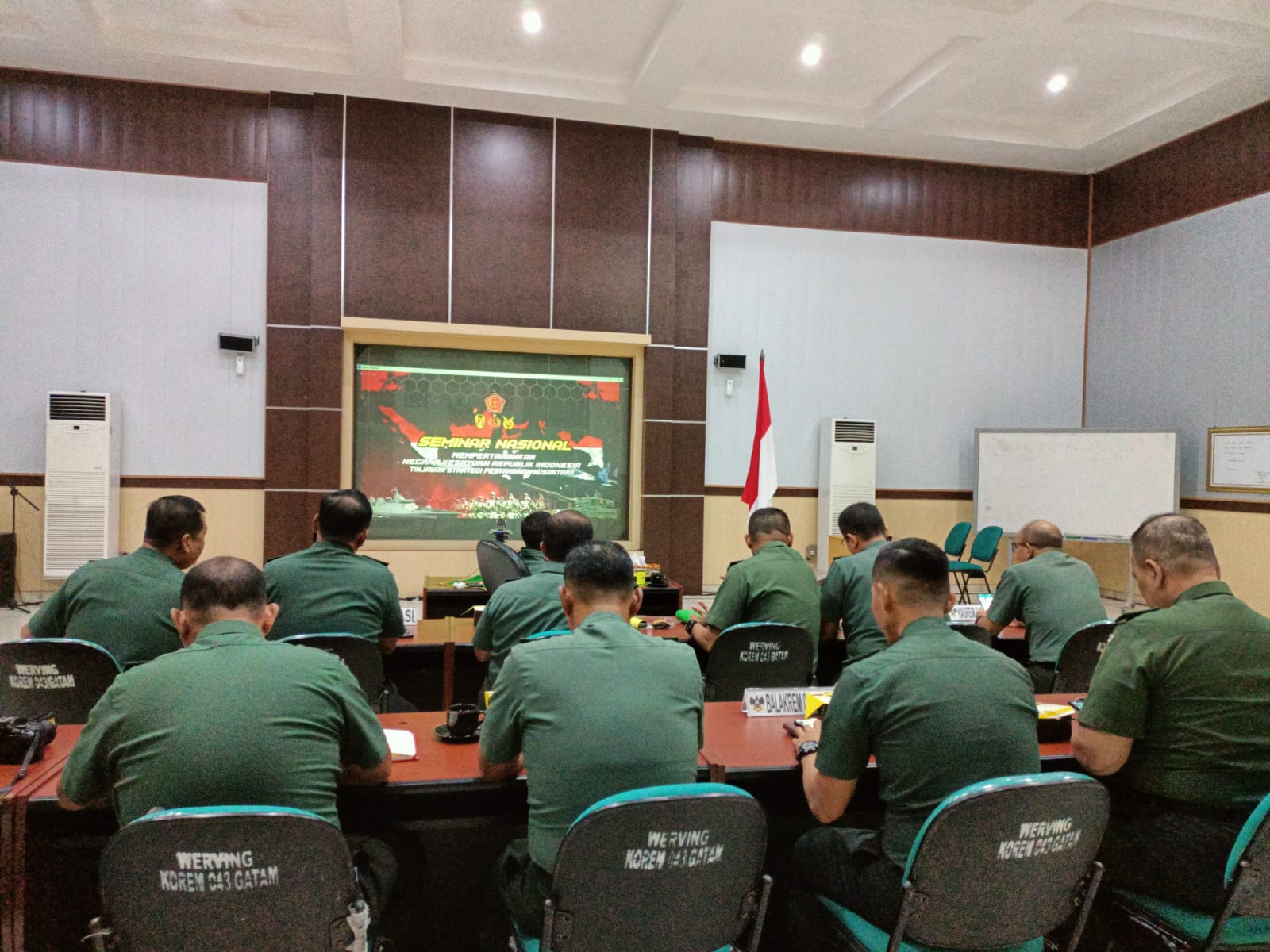 Tampak hadir mengikuti Seminar Nasional Mempertahankan NKRI Tinjauan Setrategi Pertahanan Nusantara 2023, Kasrem 043/Gatam Kolonel Inf Prasetyo, Kasiren Korem 043/Gatam Kolonel Inf Bambang Semiana, Para Kasi Kasrem 043/Gatam dan Para Perwira Staf Korem 043/Gatam.(red)