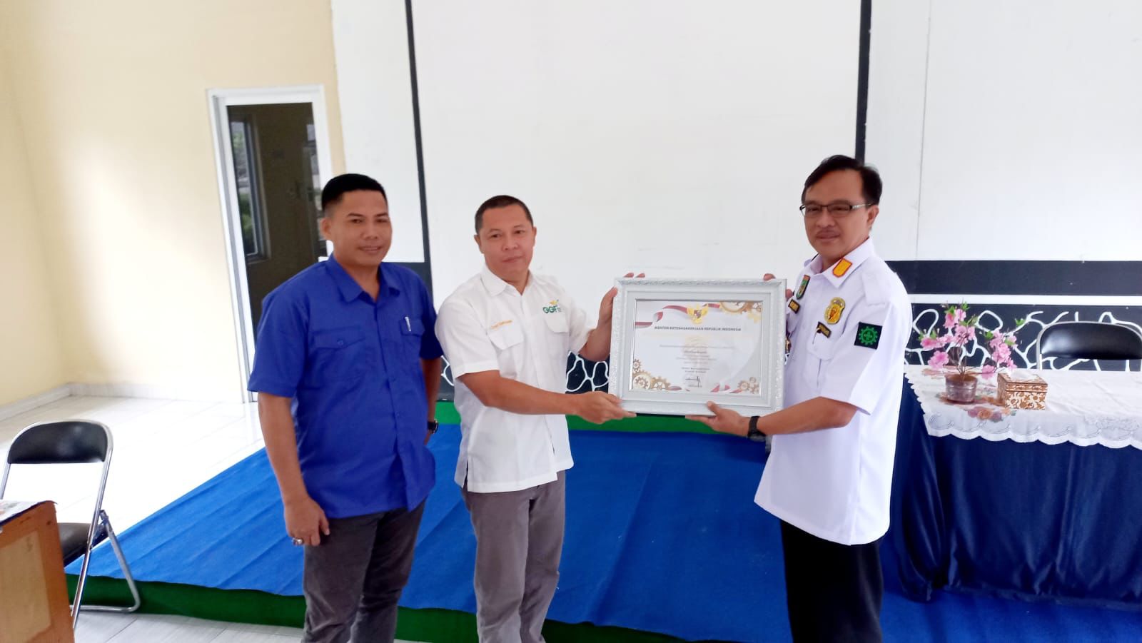 Piagam penghargaan LKS Bipartit Tahun 2022 yang ditandatangani Menteri Ketenagakerjaan Republik Indonesia Ida Fauziayah, diserahkan oleh Kepala Dinas Tenaga Kerja Propinsi Lampung Agus Nompitu kepada pihak PT GGP yang diwakili oleh People Partner Prot & Plant Based Department Head Movery Ferestian.