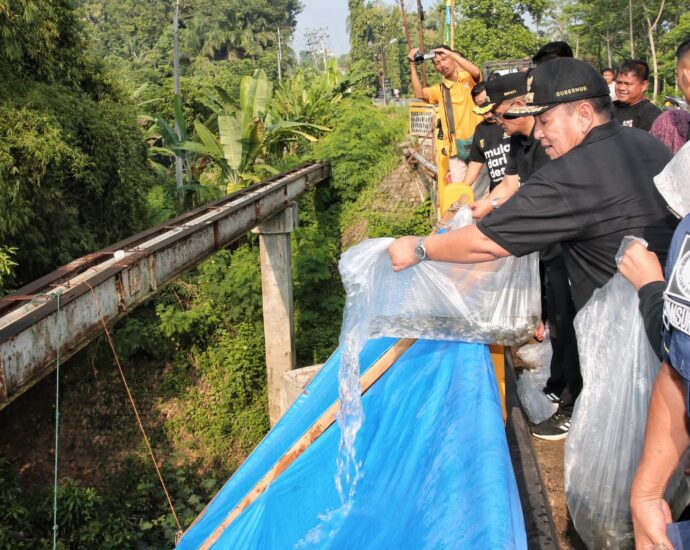 Gubernur Lampung Arinal Djunaidi menebar benih ikan di Way Sesah, Kelurahan Kota Alam, Kotabumi dan di Kecamatan Abung Timur, pada saat melakukan Kunjungan Kerja di Kabupaten Lampung Utara, Selasa (21/5/2024).