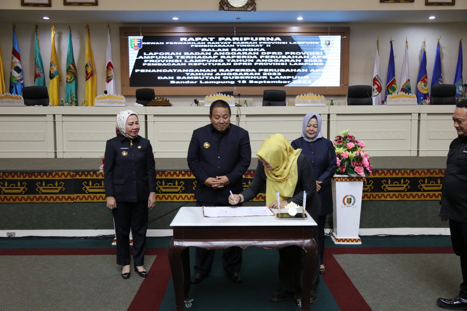 BANDAR LAMPUNG (KANDIDAT) – Gubernur Lampung Arinal Djunaidi dan Pimpinan DPRD Provinsi Lampung menandatangani Raperda Perubahan APBD Provinsi Lampung Tahun Anggaran 2023, dalam Sidang Paripurna Pembicaraan Tingkat II Persetujuan Bersama Terkait Rancangan Perubahan Anggaran Daerah APBD Provinsi Lampung Tahun Anggaran 2023, di Ruang Sidang Paripurna, Senin, (18/9/2023).