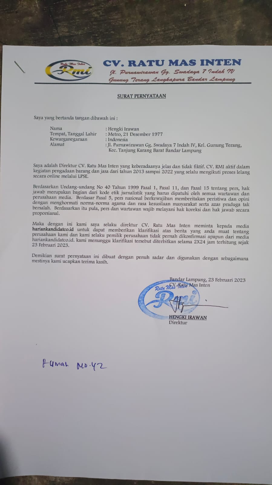 Maka dengan ini kami saya selaku Direktur CV. Ratu mas inten minta kepada media Hariankandidat.co.id untuk dapat memberikan klarifikasi atas berita yang anda muat tentang perusahaan kami dan kami selaku pemilik perusahaan tidak pernah dikonfirmasi apapun dari media Hariankandidat.co.id kami menunggu klarifikasi tersebut diterbitkan selama 2×24 jam terhitung sejak 23 Februari 2023.