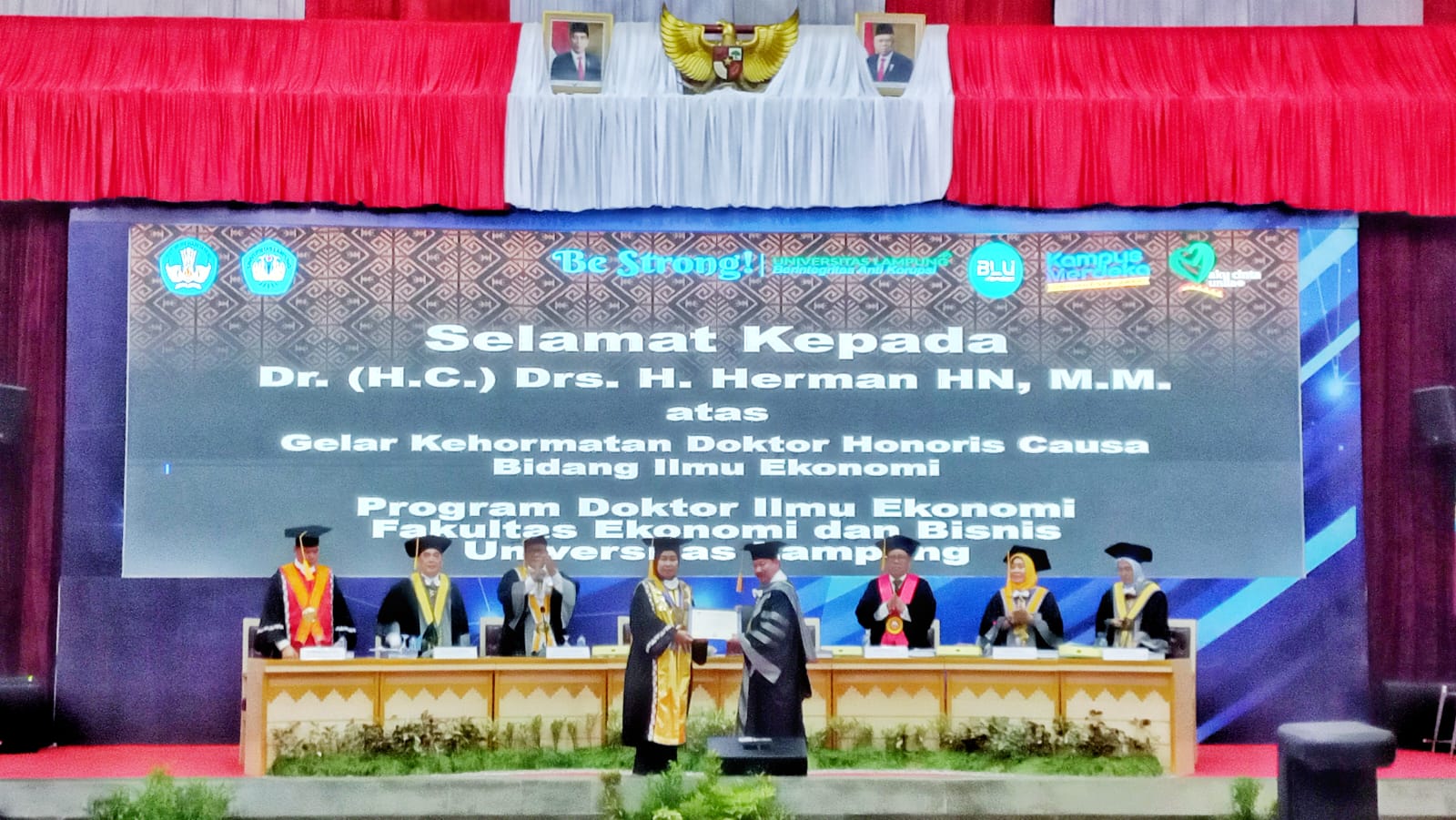 BANDAR LAMPUNG (KANDIDAT) – Herman HN Dianugerahi Gelar Doktor Honoris Causa, Bidang Ilmu Ekonomi oleh Universitas Lampung atas Kontribusi Luar Biasa dalam Pembangunan Lampung.