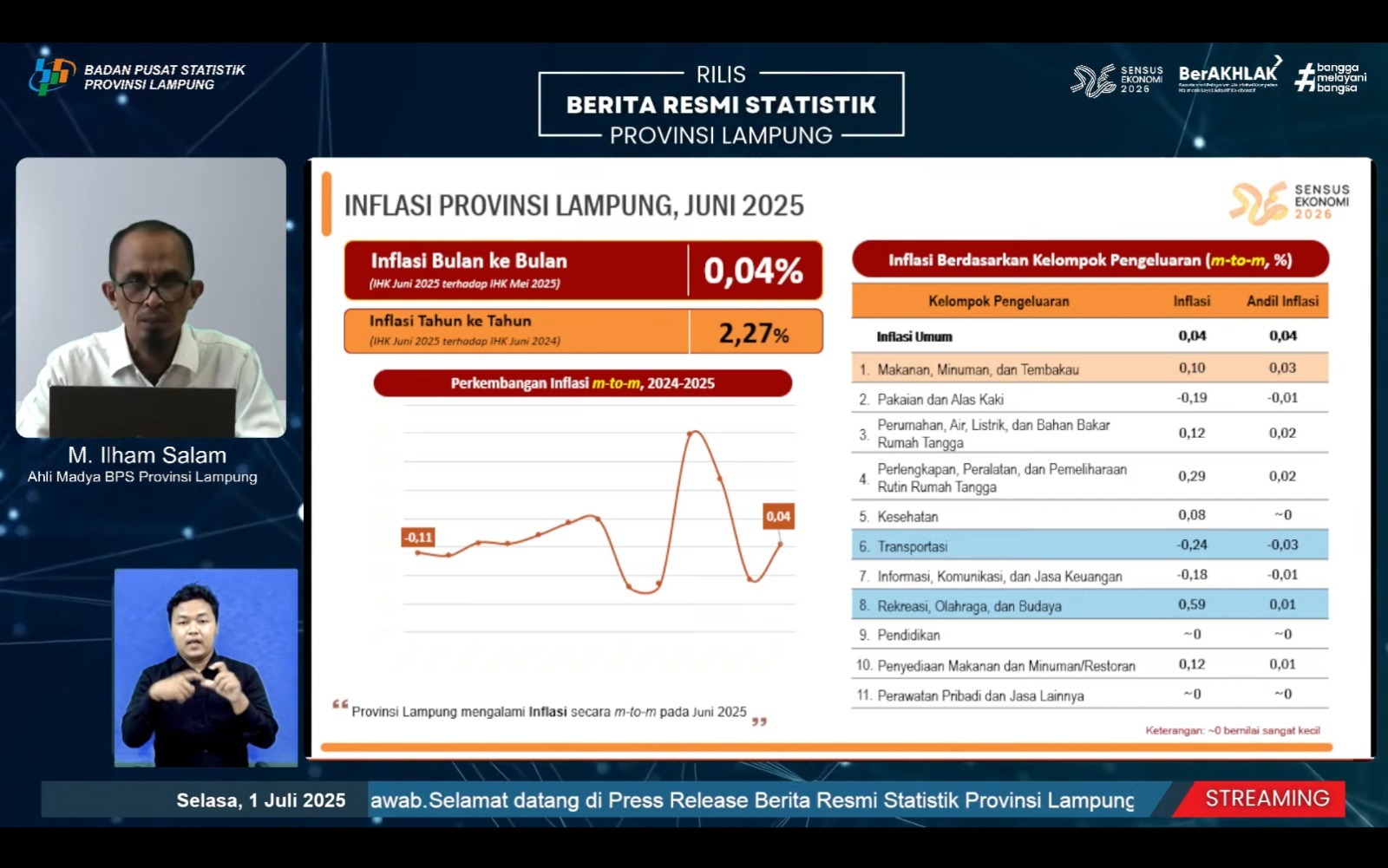 BANDAR LAMPUNG (KANDIDAT) – Badan Pusat Statistik (BPS) Provinsi Lampung mencatat inflasi sebesar 0,04 persen secara bulanan (month-to-month/m-to-m) pada Juni 2025.