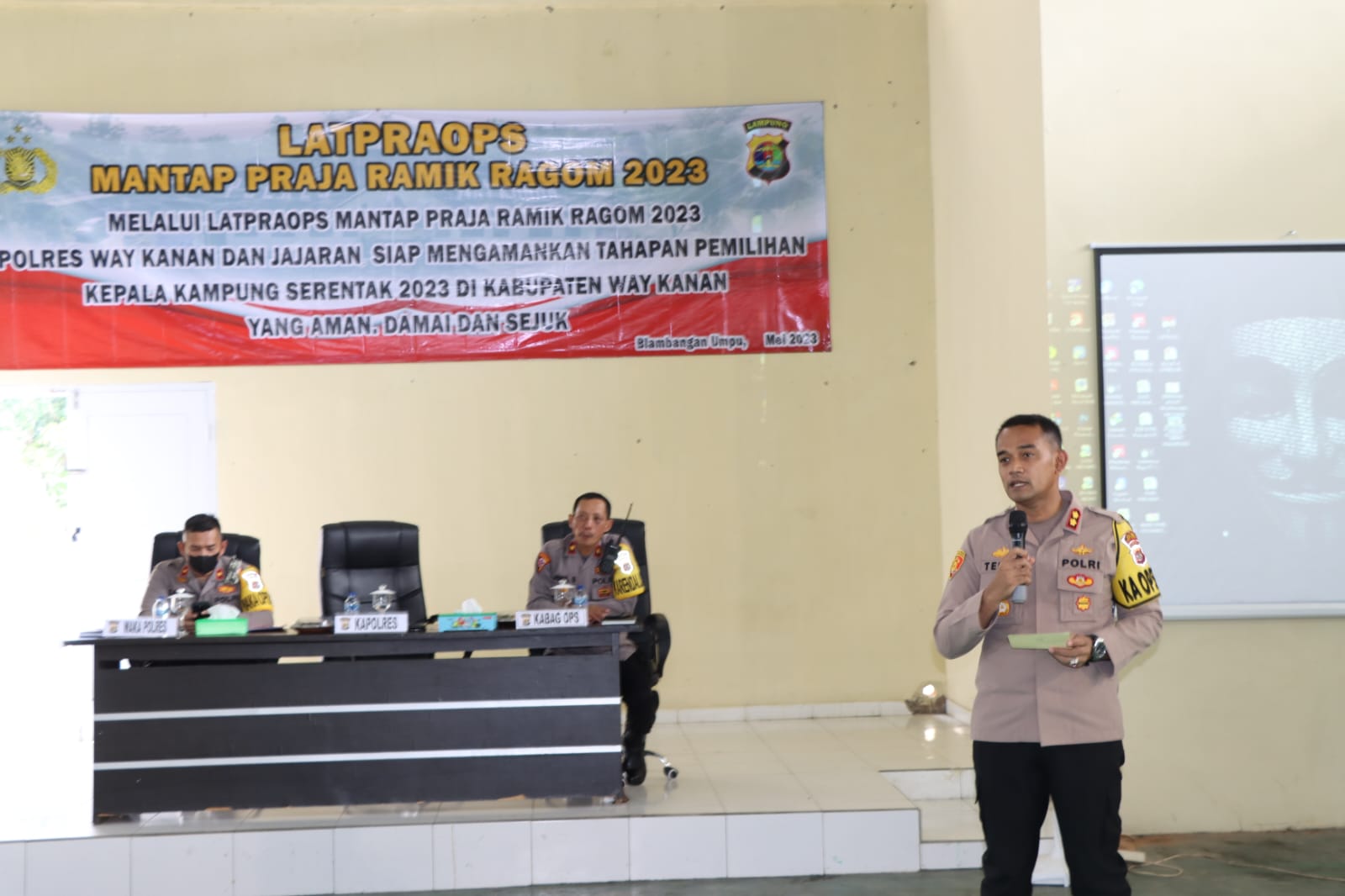Latpraops Mantap Praja Ramik Ragom 2023 mengusung tema “ Polres Way Kanan dan Jajaran siap mengamankan tahapan pemilihan kepala kampung (Pilkakam) serentak di Kabupaten Way Kanan yang aman, damai dan sejuk”.