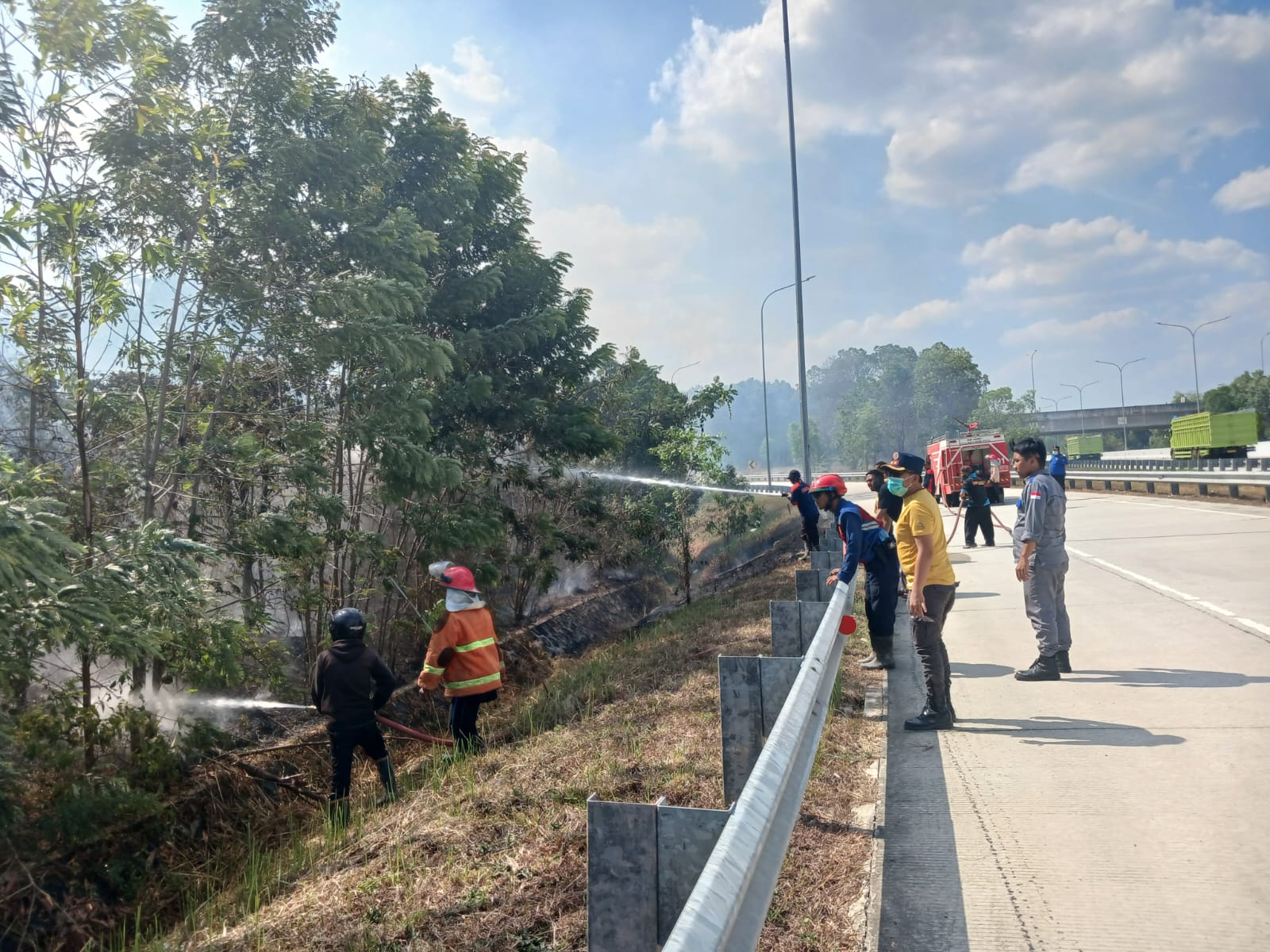 Ferry Antoni Sekretaris Damkartan Pemkab Mesuji di lokasi kebakaran mengatakan, pihaknya diminta bantuan dari pihak jalan tol Hutama Karya (HK) untuk memadamkan api yang telah berkobar di sisi jalan pintu tol keluar KM 208 Way Kenanga, Way Serdang Mesuji, Lampung.