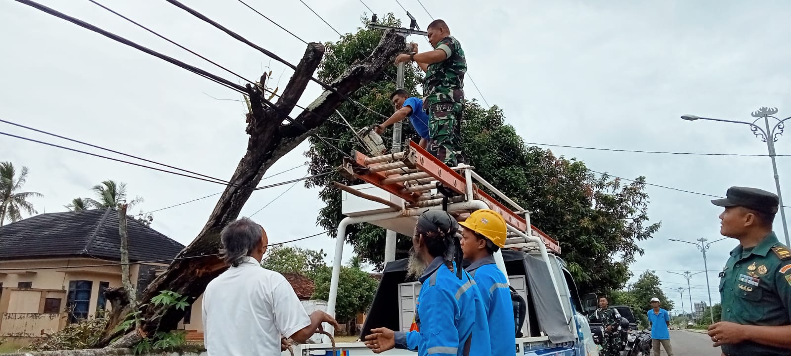 Seperti yang di lakukan Danramil 429-05/Sukadana Kodim 0429/Lamtim Lettu Inf. Sugiri bersama anggotanya membantu pihak PLN dan Kasi Pertamanan Lamtim mengevakuasi pohon tumbang di Desa Mataram Marga yang menimpa instalasi listrik, Rabu (25/1).