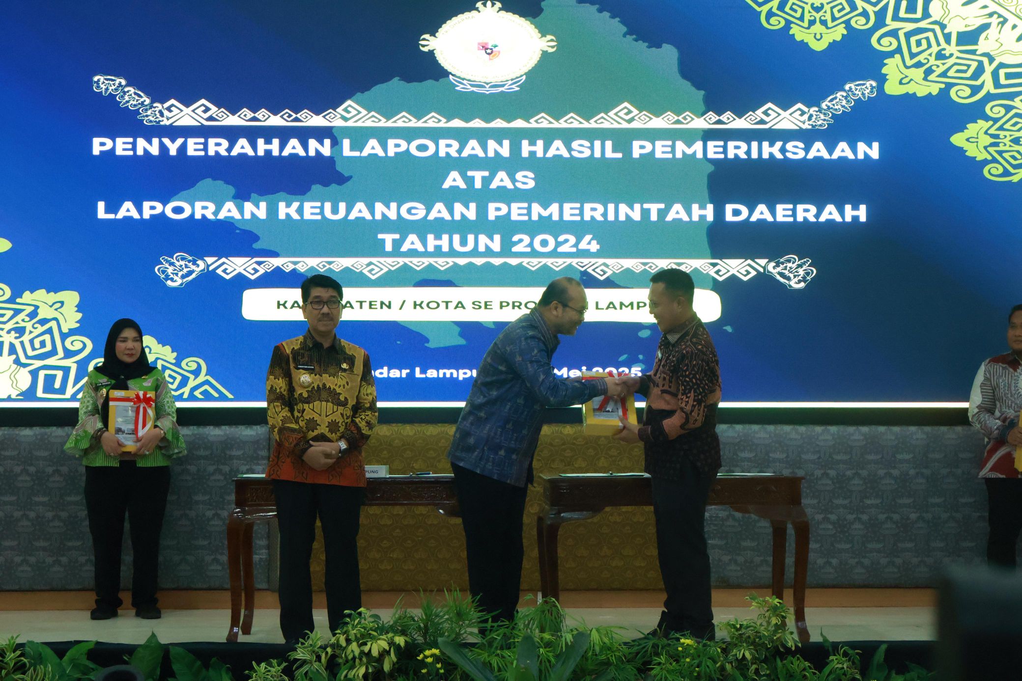 Penyerahan Laporan Hasil Pemeriksaan (LHP) atas LKPD Tahun Anggaran 2024 dilakukan oleh Kepala BPK RI Perwakilan Provinsi Lampung, Nugroho Heru Wibowo, S.E., M.Comm., CSFA, ACPA, CA, Ak., kepada Bupati Lampung Utara, Dr. Ir. H. Hamartoni Ahadis, M.Si., dalam acara resmi yang digelar di Aula Krakatau, Kantor BPK RI Perwakilan Provinsi Lampung, Bandar Lampung, Senin (26/5/2025).