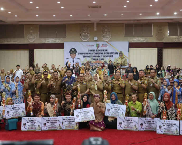 Hal tersebut disampaikan Pj. Gubernur Samsudin saat menghadiri penyerahan hadiah bagi para pemenang Lomba Pemilihan Guru Bahasa Lampung Berprestasi Tingkat Provinsi Lampung Tahun 2024, di Gedung Pusiban, Selasa (24/9/2024).