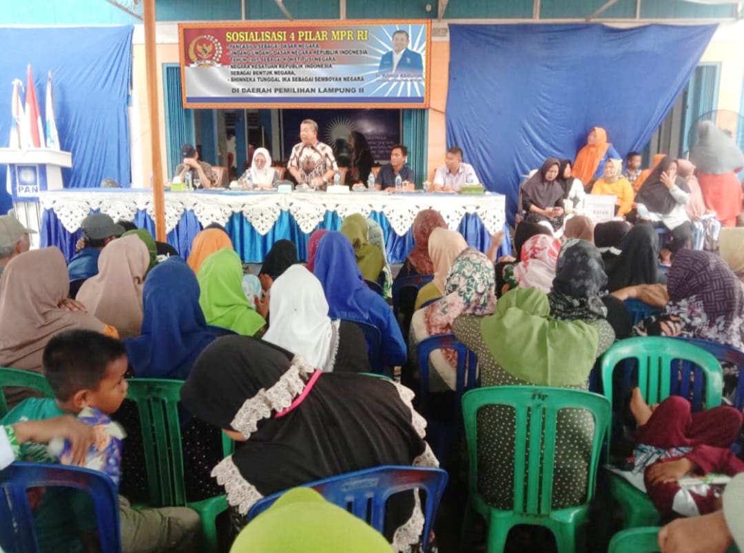 LAMPUNG UTARA (KANDIDAT) – Anggota MPR RI dari Fraksi PAN yang juga anggota DPR RI Komisi IV Ir. Alimin Abdullah, menggelar sosialisasi empat pilar kebangsaan (Pancasila, UUD 1945, Negara Kesatuan Republik Indonesia dan Bhineka Tunggal Ika), di Way Jepara Lampung Timur, Jum’at (10/05/2024).