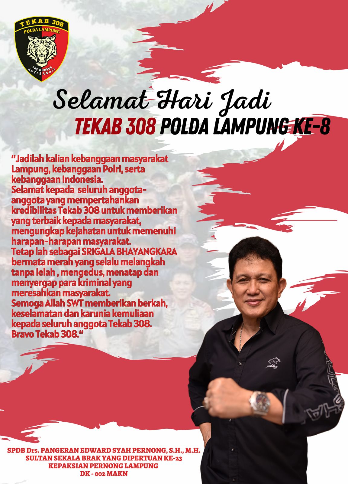 Sai Batin Puniakan Dalam Beliau (SPDB) Pangeran Edward Syah Pernong Gelar Sultan Sekala Brak yang di pertuan ke-23, Kepaksian Pernong ini berpesan agar Tekab 308 tetap menjadi SRIGALA BHAYANGKARA bermata merah yang selalu melangkah tanpa lelah , mengendus, menatap dan menyergap para kriminal yg meresahkan masyarakat.