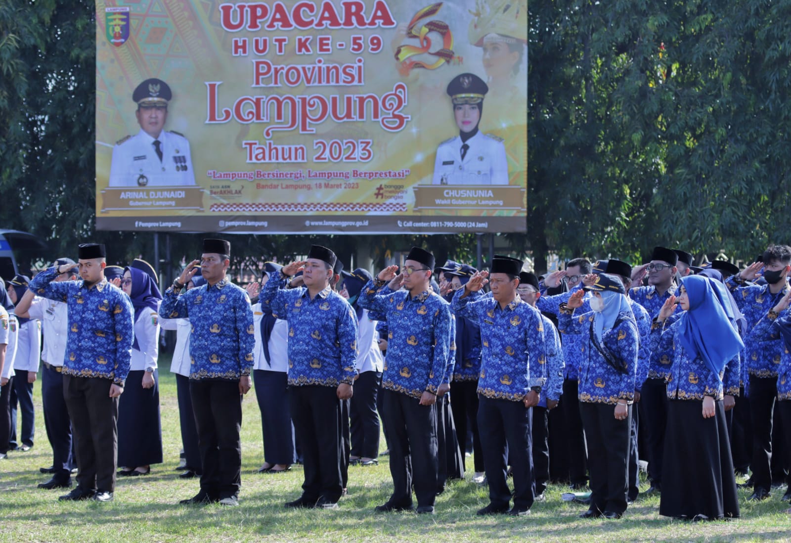 BANDARLAMPUNG (KANDIDAT) – Gubernur Lampung Arinal Djunaidi menjadi Inspektur Upacara pada Upacara Peringatan HUT Ke-59 Provinsi Lampung, di Lapangan Korpri, Komplek Kantor Gubernur Lampung, Jumat pagi (17/3/23).