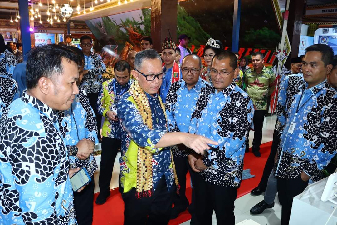Pj. Bupati didampingi Sekretaris Daerah (Sekda) Drs. Lekok, M.M., beserta jajaran menyempatkan diri melihat langsung masing-masing stan yang ada di anjungan Kabupaten Lampung Utara.