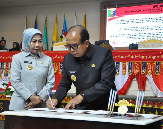 Penjabat Gubernur Lampung Samsudin bersama Ketua Dewan Perwakilan Rakyat Daerah (DPRD) Provinsi Lampung Mingrum Gumay menandatangani Persetujuan Bersama Terhadap Rancangan Peraturan Daerah tentang APBD Provinsi Lampung Tahun Anggaran 2025, di Ruang Sidang Paripurna DPRD Provinsi Lampung, Jumat (30/08/2024).
