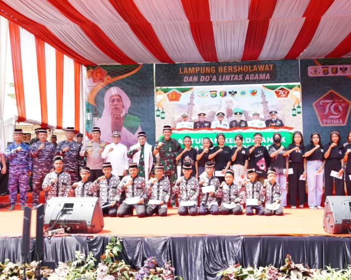 Penjabat Gubernur Lampung Samsudin menghadiri acara Lampung Bershalawat dan Doa Lintas Agama dalam rangka memperingati HUT Ke-79 TNI Tahun 2024 bertempat di Lapangan Saburai, Minggu (22/09/2024).