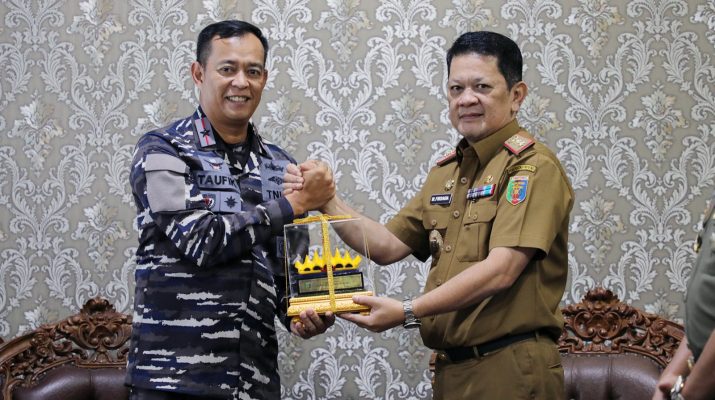 Pj. Sekretaris Daerah Provinsi (Sekdaprov) Lampung Muhammad Firsada, menerima kunjungan kehormatan (courtesy call) Komandan Gugus Tempur Laut (Danguspurla) Koarmada I Jakarta Laksamana Pertama Mohamad Taufik, di Ruang Kerja Sekretaris Daerah Provinsi Lampung, Kompleks Kantor Gubernur, Bandarlampung, Senin (24/3/2025).