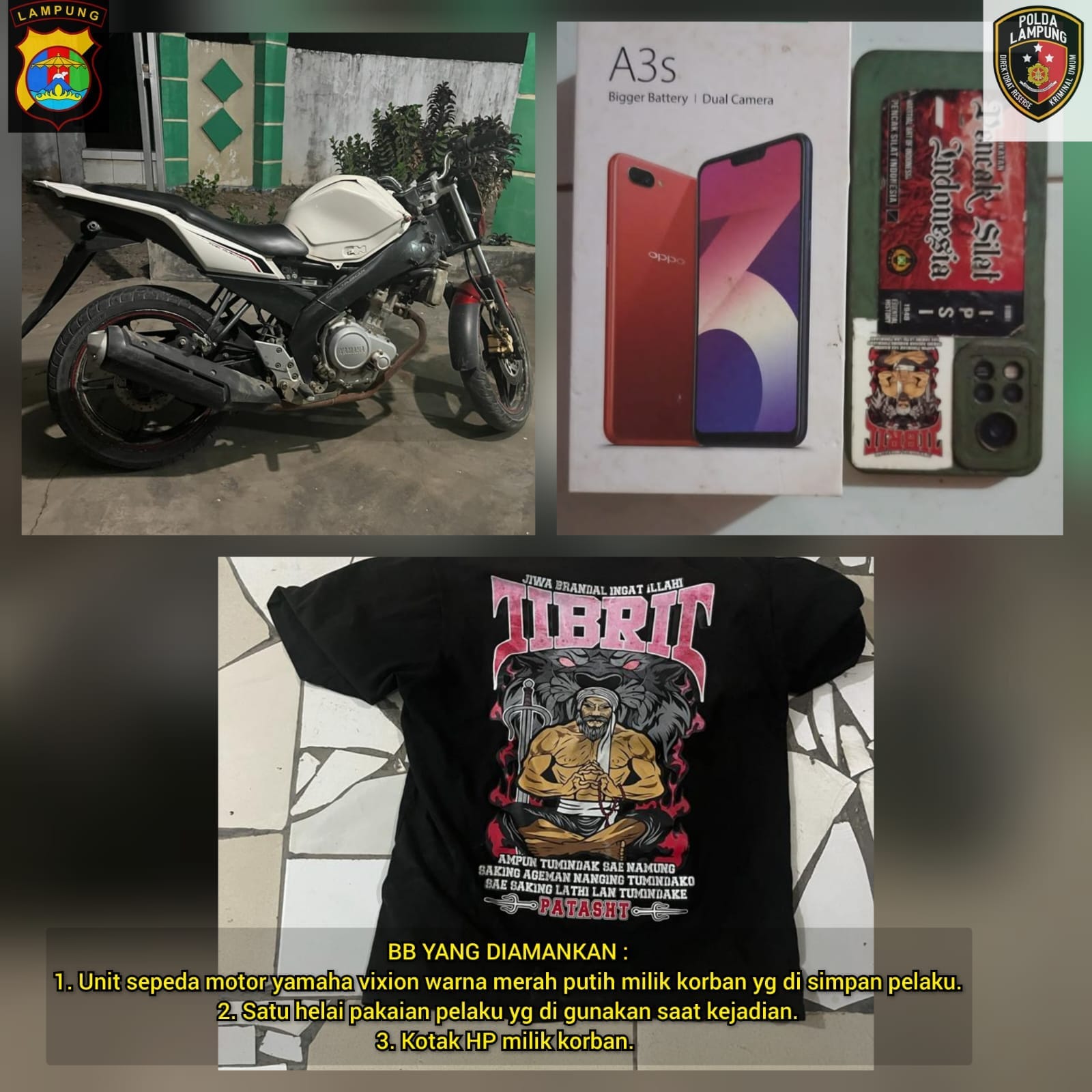 Pelakunya, NR (18) dan AM (16), warga Dusun 3 Sumber Baru Kecamatan Seputih Banyak. Polisi juga berhasil mengamankan barang bukti sepeda motor Yamaha Vixion milik korban, yang sebelumnya disembunyikan pelaku.