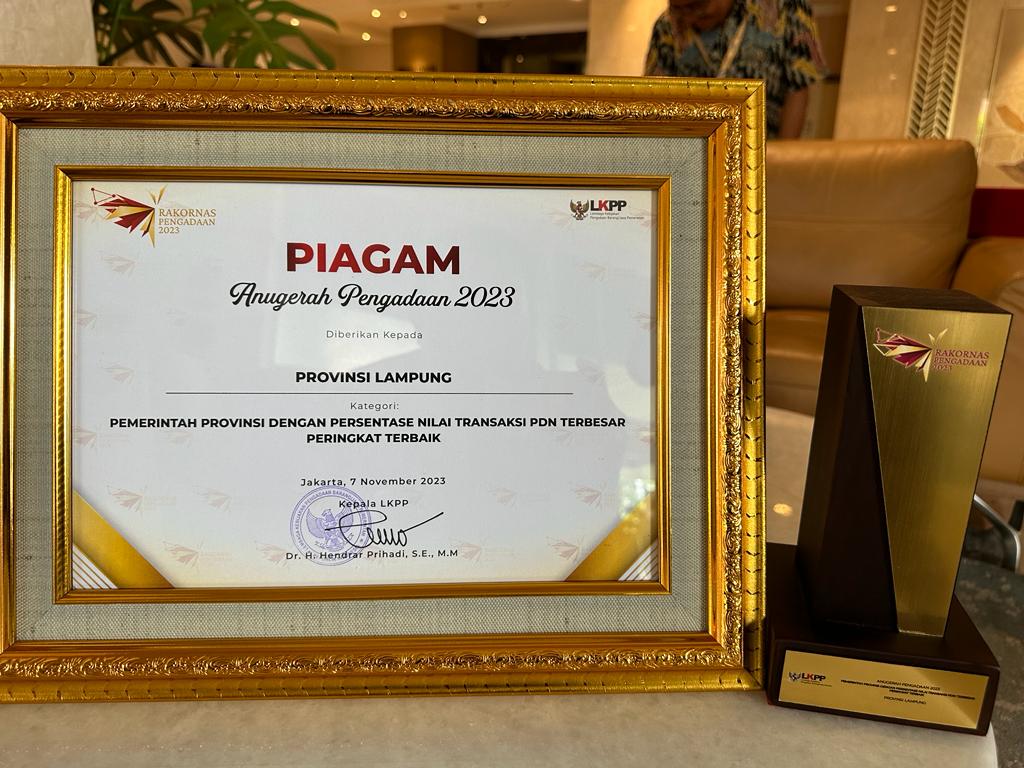 Penghargaan diserahkan langsung oleh Kepala Lembaga Kebijakan Pengadaan Barang Pemerintah (LKPP) Republik Indonesia Hendrar Prihadi kepada Gubernur Lampung Arinal Djunaidi, pada Rapat Koordinasi Nasional Pengadaan Barang/Jasa Pemerintah 2023 dengan tema “Transformasi Pengadaan Untuk Indonesia Maju” yang diselenggarakan pada 7-8 November 2023 di Hotel Bidakara Jakarta.