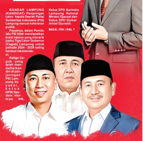 Ketiga Cagub yang telah mendaftarkan diri di penjaringan PSI Lampung itu yakni, ketua DPW Nasdem Herman HN, Ketua DPD Gerindra Lampung Rahmat Mirzani Djausal dan Ketua DPD Golkar Arinal Djunaidi.