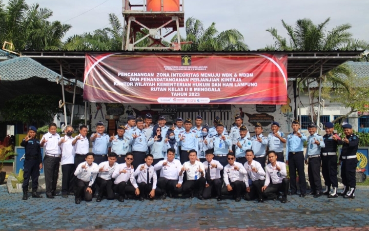 TULANG BAWANG (KANDIDAT) – Rumah Tahanan Negara Kelas IIB Menggala melaksanakan pencanangan pembangunan zona integritas (ZI) menuju wilayah bebas korupsi (WBK) dan wilayah birokrasi bersih dan melayani (WBBM) dan Penandatanganan Perjanjian Kinerja Kantor Wilayah Kementerian Hukum dan HAM Lampung Tahun 2023.