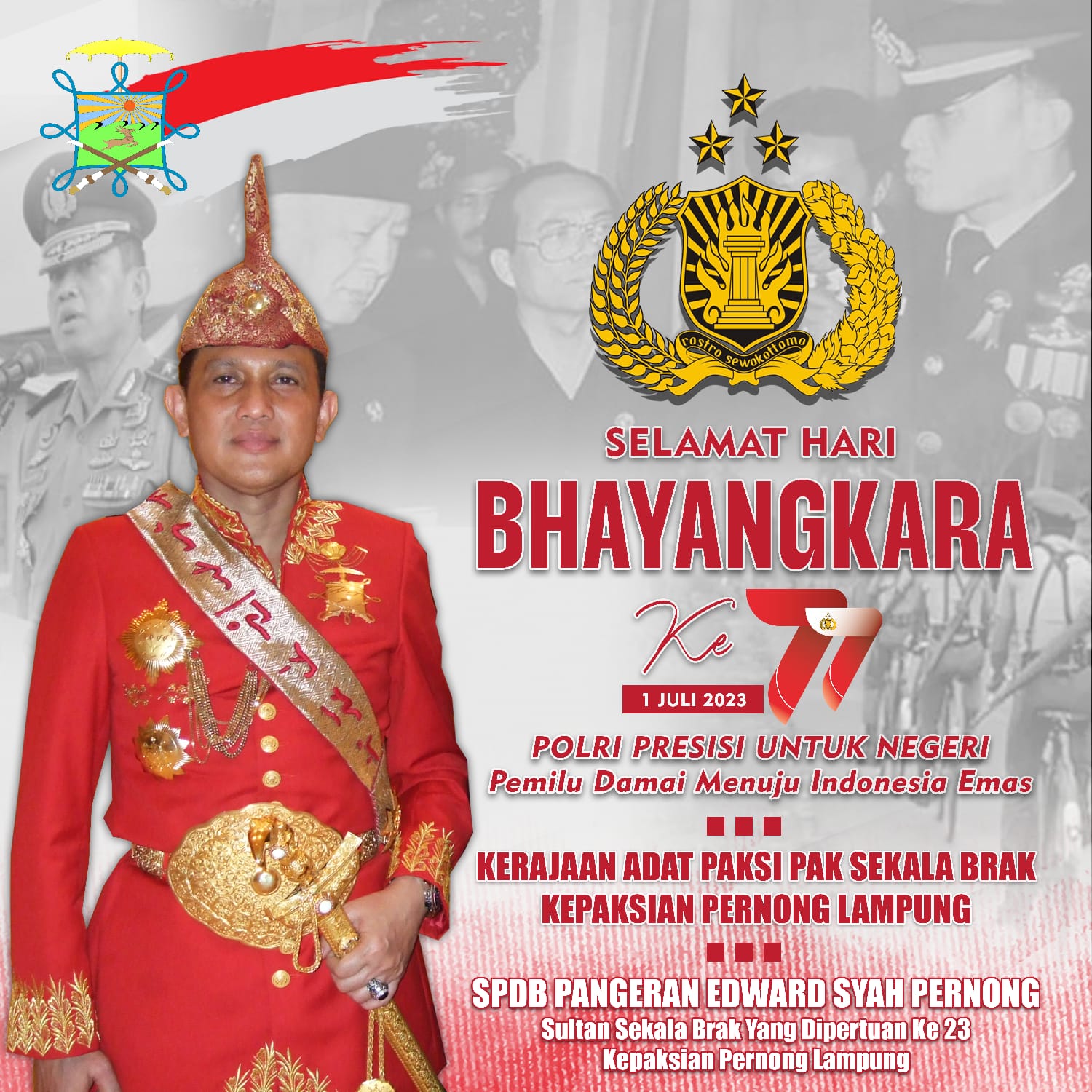 BANDAR LAMPUNG (KANDIDAT) – Sai Batin Puniakan Dalom Beliau (SPDB) Pangeran Edward Syah Pernong, gelar Sultan Skala Brak yang dipertuan ke 23, Sultan kerajaan Adat Paksi Pak Skala Brak Kepaksian Pernong Lampung, mengucapkan hari Ulang Tahun Kepolisian Republik Indonesia ke-77 Tahun 2023, Sabtu (1/7).
