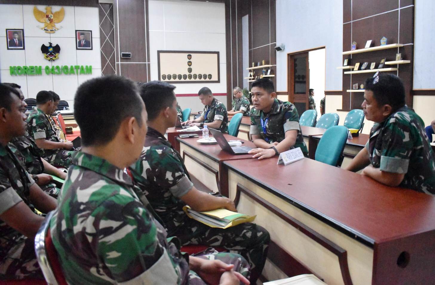 “Jalin komunikasi yang baikndengan tim dan konsultasikan hal-hal yang perlu mendapatkan perbaikan, sehingga dapat menjadi bahan masukan dan pedoman guna peningkatan kualitas kinerja dan ketertiban administrasi Korem 043 Gatam di masa yang akan datang,” ujar Kolonel Inf Prasetyo.