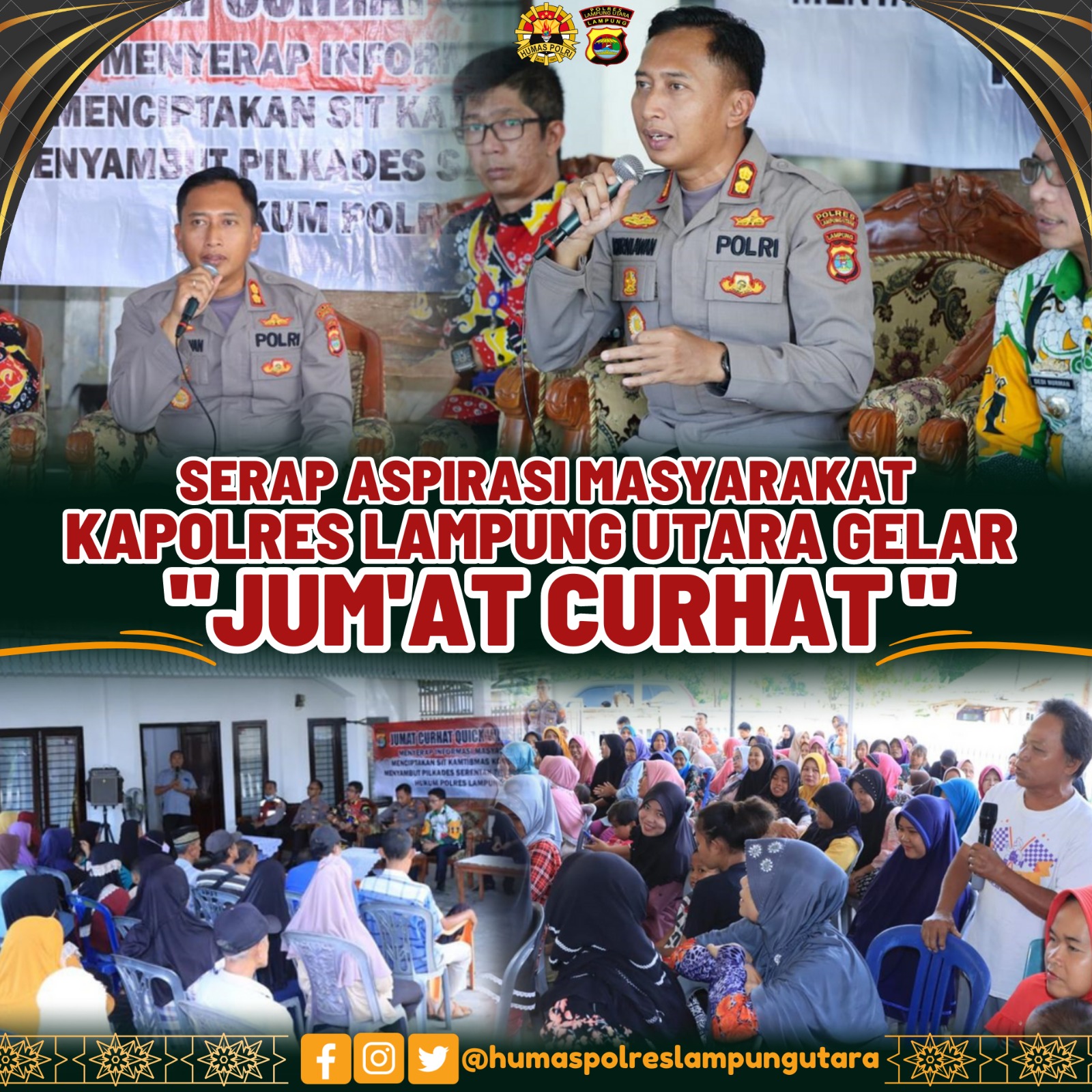 LAMPUNG UTARA (KANDIDAT) – Warga Tanah Miring Kelurahan Kota Alam Kecamatan Kotabumi Selatan Lampung Utara merespon positif kegiatan “Jumat Curhat” yang digelar oleh Kepolisian Resor (Polres) Lampung Utara.